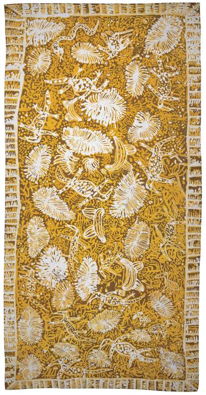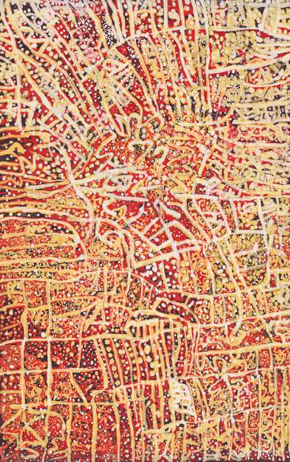 In the many vibrant batik works that Kngwarray produced over a decade, she continued to lay out the groundwork of her Country. Literally drawn into the frame of some of these works on cotton and silk are key emblematic references to the flora and fauna of her Country, as well as her identity as a woman from Alhalker. In an untitled textile work of 1981, mirrored, trailing lines are linked by a bulbous node and cast delicate webs, suggesting both the above-ground and underground plant growth of anwerlarr and kam. Here, too, are other creatures of Alhalker, including centipedes, lizards and emus, all etched in gold against the dyed deep reds resonant of desert sand. The opportunity to document and share the beauty and power of her Country in a new medium and for new audiences seems to have inspired the fulsomeness of the subject matter Kngwarray depicted in her early batik works.