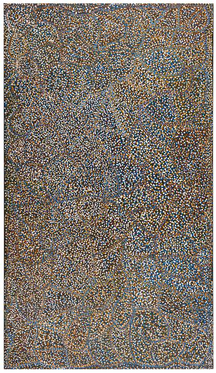 Within the context of a flourishing, and often unethical, commercial Aboriginal arts sector, Kngwarray continued to confound and stimulate audiences in Australia as well as around the world. Her style evolved rapidly as she repeatedly tapped the deep wellspring of culture and creativity that is Alhalker Country. For instance, the stippled works made between 1990 and 1991 are enlarged and elongated in comparison to earlier paintings. Within these elegant paintings, distinctive motifs such as the anwerlarr tubers and emu footprints are submerged or disappear completely in favour of billowing fields of dots that expand or contract across the surface of the canvas.
