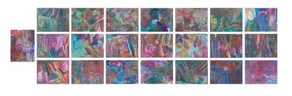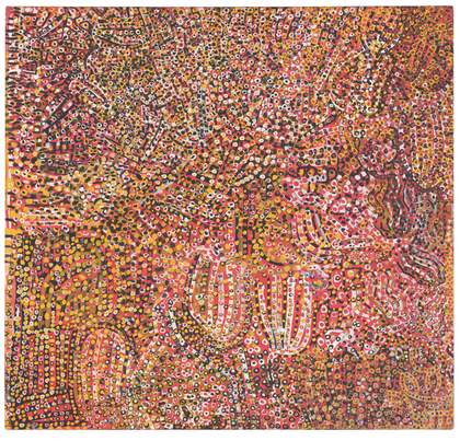 Between 1989 and 1996, Kngwarray decisively broadened the colour spectrum and techniques in her works. The most ambitious work of this era is the 22-panel opus entitled The Alhalker Suite 1993, its scale and title implying a kaleidoscopic view of Alhalker. From the intimate perspective of its creator, it is perhaps more accurately a multifaceted portrait of a sentient land. It can be imagined that the painting offers an aerial perspective of winding waterways and changing topographies, all condensed within a work that collectively conveys an intense gravitational energy. Through the eyes of Kngwarray’s countrywomen, the high-keyed colour palette captures seasonal change and the shifting light over a timeless land.
